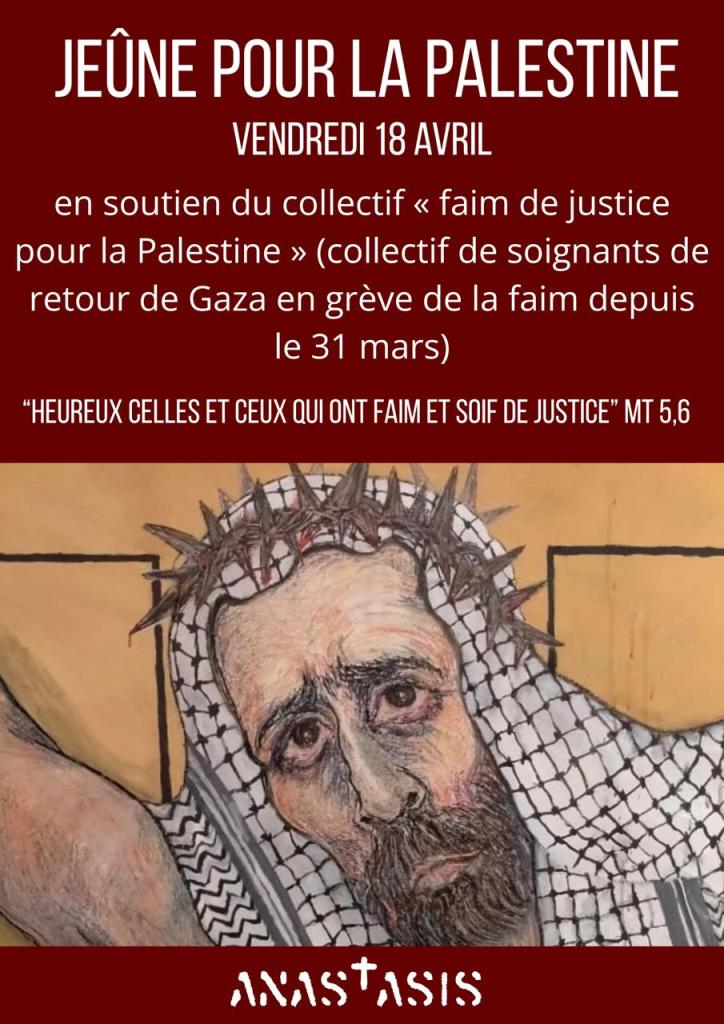 Le collectif Anastasis soutient les revendications du collectif Faim de justice pour la Palestine et invite chacune et chacun à pratiquer un jeûne en signe de solidarité. Nous vous invitons également à faire connaître le collectif Faim de justice pour la Palestine dans vos églises et à y relayer notre appel au jeûne solidaire du Vendredi Saint. Vous pouvez également écrire directement au collectif Faim de justice pour la Palestine afin de les accueillir et relayer leur démarche dans vos paroisses, si vous habitez dans l’une des villes où ils passent.